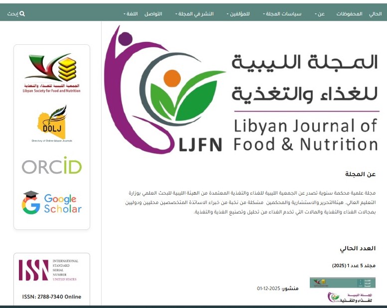 بحمدا لله وتوفيقه تم قبول واعتماد المجلة الليبية للغذاء والتغذية التي تصدر عن الجمعية الليبية للغذاء والتغذية في منصة دليل المجلات الليبية الإلكترونية (DOLJ) في بوزارة التعليم العالي كمجلة علمية محكمة ومعتمدة