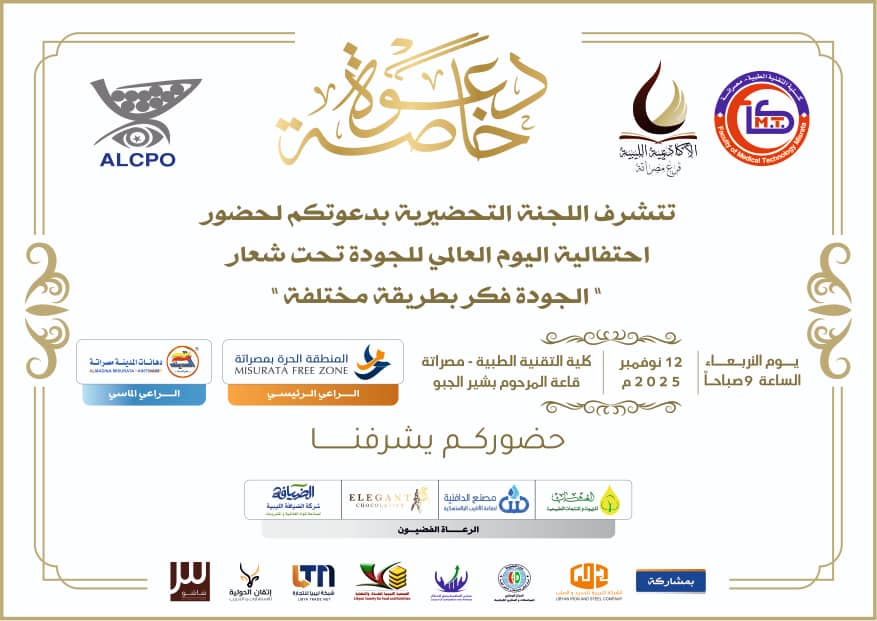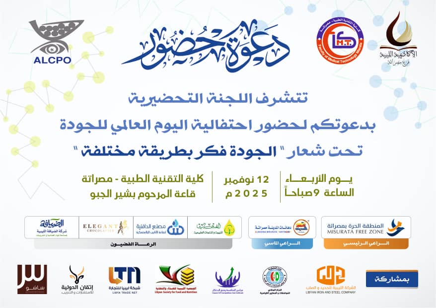 مشاركات_علمية. .يسعدنا بالجمعية الليبية للغذاء والتغذية أن أتقدم بجزيل الشكر لمنظمة الرقيب لحماية المستهلك على الدعوة الكريمة للمشاركة في احتفالية اليوم العالمي للجودة، الذي يصادف 11 نوفمبر 2025.والذي شارك فيها كل من السيد /د ابراهيم غريبي رئيس مجلس ادارة الجمعية والسيد / أ.عبدالرزاق حكم عضو مجلس ادارة بالجمعية ورئيس قسم الاقتصاد المنزلى بمحاضرات علمية بهذه المناسبة، يتقدم. مجلس ادارة الجمعية وجميع اعضاء الجمعية العمومية للجمعية بالتهنئة لجميع العاملين في مجال الجودة، ونؤكد على أهمية دورهم في تعزيز جودة المنتجات والخدمات، وحماية حقوق المستهلكين.نؤكد مشاركة الجمعية الليبية للغذاء والتغذية في هذه الاحتفالية، ونتطلع إلى التعاون المستمر مع منظمة الرقيب لحماية المستهلك لتحقيق الأهداف المشتركة في مجال حماية المستهلك وتعزيز الجودة