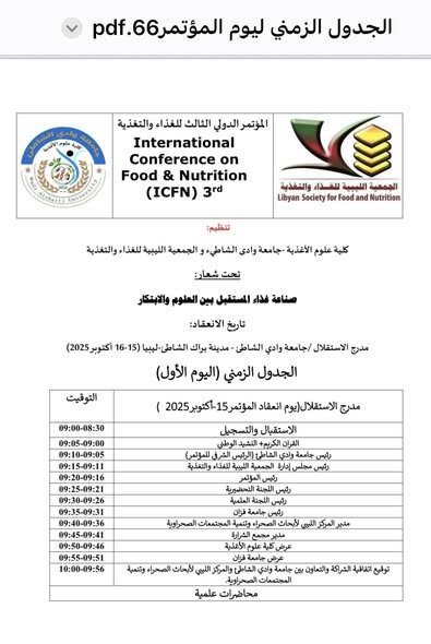 بمدرج كلية علوم الاغذية جامعة وادي الشاطئ بمدينة براك ( بالجنوب الليبي ) انطلقت فعاليات المؤتمر الدولي الثالث .. خالص الشكر والتقدير لادارة الجامعة والكلية على التنظيم والترحاب .. وهكذا تستمر تستمر جولات المؤتمر الناجحة في ربوع ليبيا الحبيبة من طرابلس 2021 الى نالوت 2023 والان براك 2025 وهكذ مجلس ادارة الجمعية وكافة الاعضاء النشطين من الجمعية العمومية على ان يكون المؤتمر نقط لقاء وترابط علمي وعملي بين ابناء الوطن الواحد